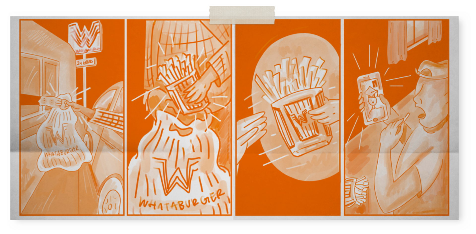 Art direction of storyboards and animation, initial concepting, photo editing, and TikTok mockup creation. Proposed What-A-Burger concept to advertise the brand on TikTok by sharing memorable moments and staying connected through the pandemic. How do you connect when there's a pandemic outside? Suddenly tradition takes the backseat as safety becomes the most important factor, but that doesn't mean we can't connect in other ways. This spec campaign made for Whataburger's transition into TikTok focuses on bringing people together and sharing fun moments while we're apart.